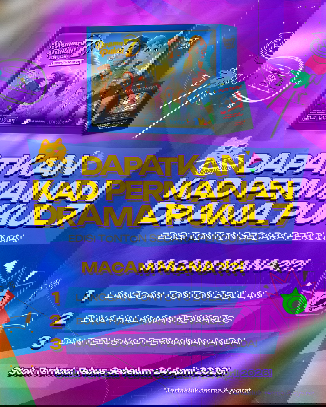 Namun, kempen ini tidak berhenti pada ganjaran berbentuk baucar. Sebuah elemen kreatif turut diperkenalkan melalui permainan kad “Drama Pukul 7” (Edisi Tonton), hasil kolaborasi bersama Meja Belakang. Permainan ini menghidupkan semula karakter daripada drama ikonik seperti Perempuan Itu dan Nur, membolehkan pemain menyusun strategi, mempertahankan watak, dan ‘menjatuhkan’ lawan dalam suasana yang penuh dramatik, seolah-olah dunia skrin kecil dipindahkan ke atas meja permainan.