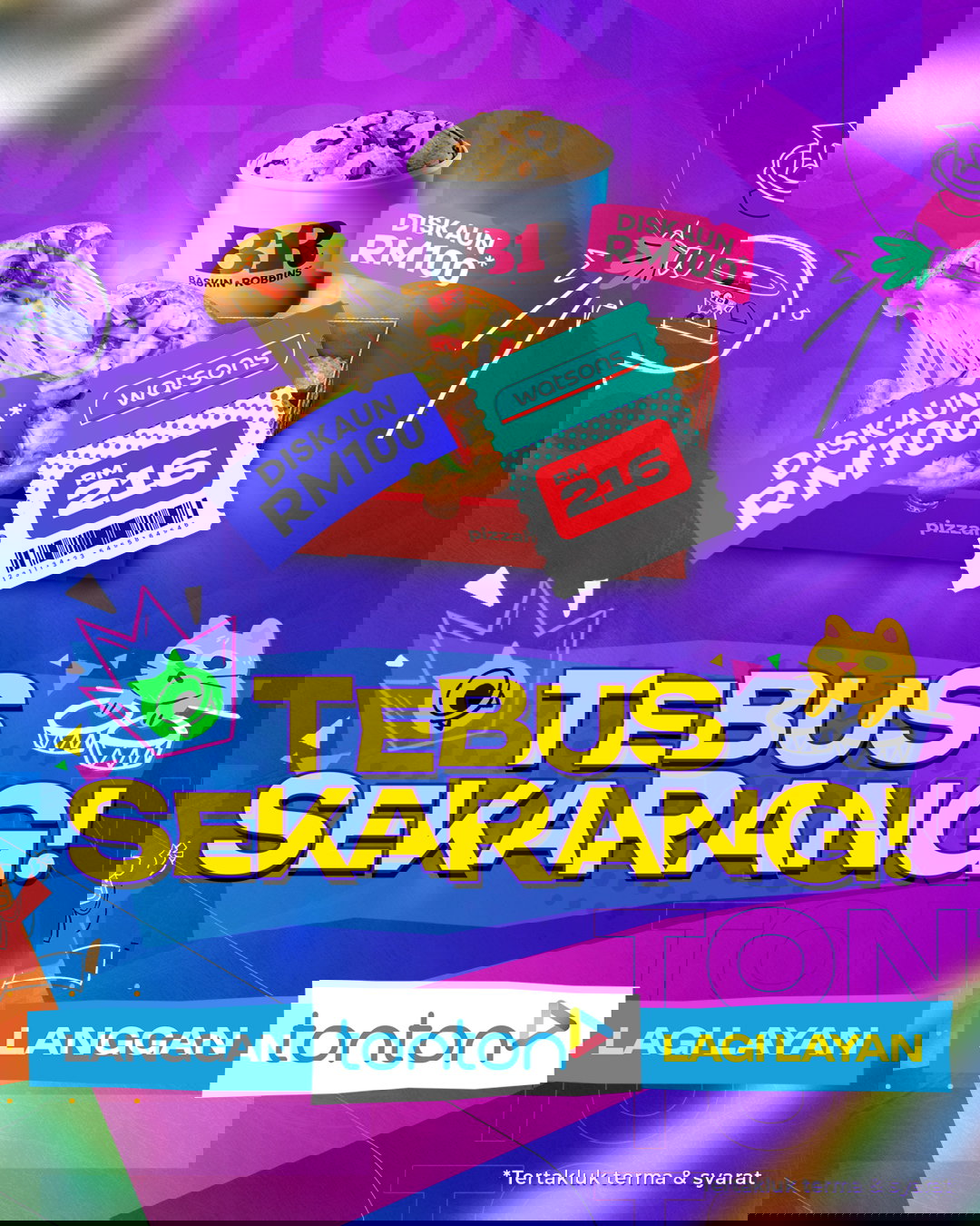 Bagi pelan 3 bulan, ganjaran menjadi lebih ‘berlapis’. Baucar RM20 Baskin Robbins setiap bulan digandingkan dengan baucar RM40 daripada Pizza Hut, mencipta kombinasi yang menyatukan hiburan dan pengalaman santai dalam satu pakej. Sementara itu, pelanggan pelan 12 bulan bakal menikmati manfaat paling ‘padu’, termasuk baucar RM100 Pizza Hut serta baucar RM216 daripada Watsons, sebuah ganjaran yang terasa seperti hadiah kepada kesetiaan yang berpanjangan.