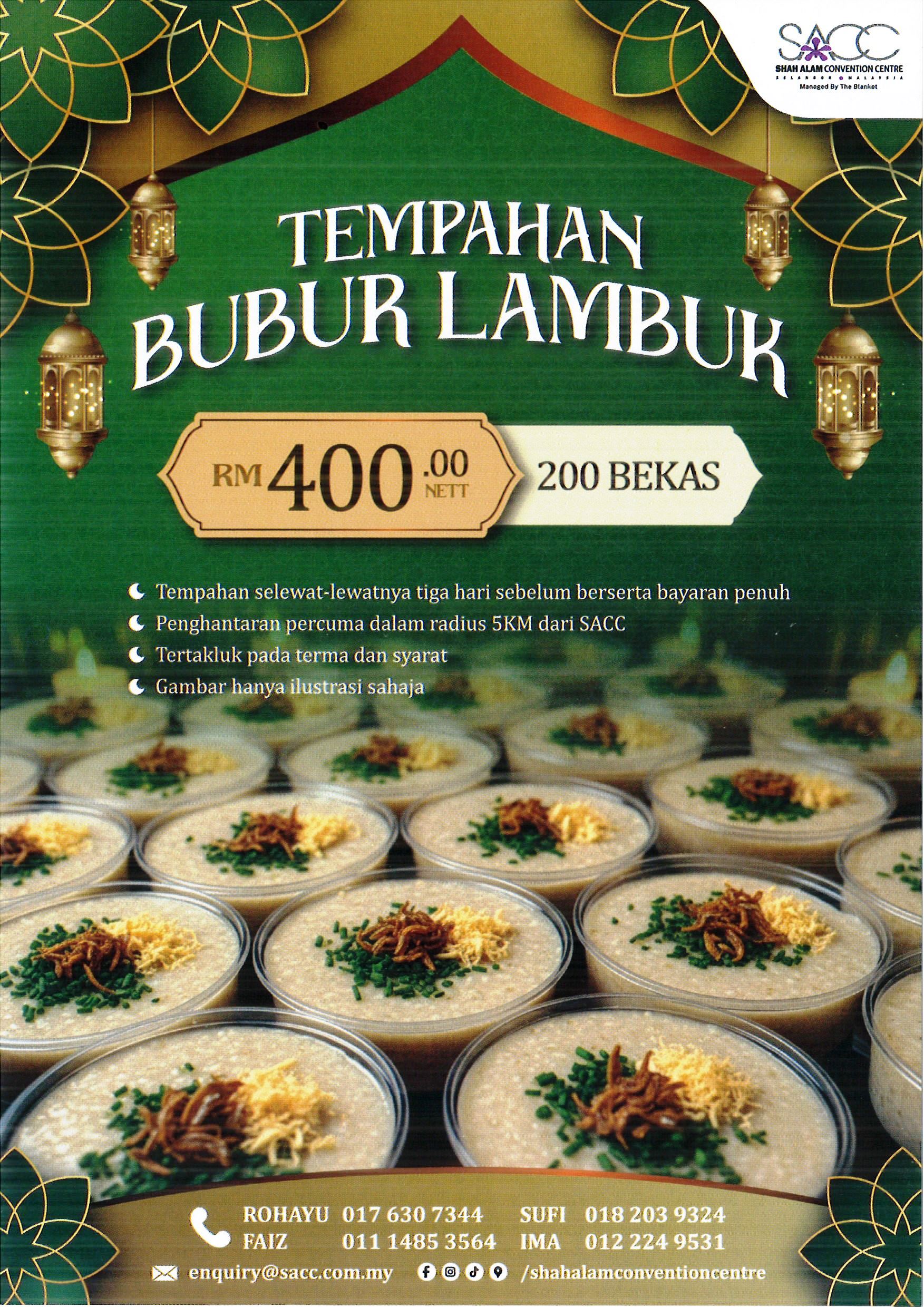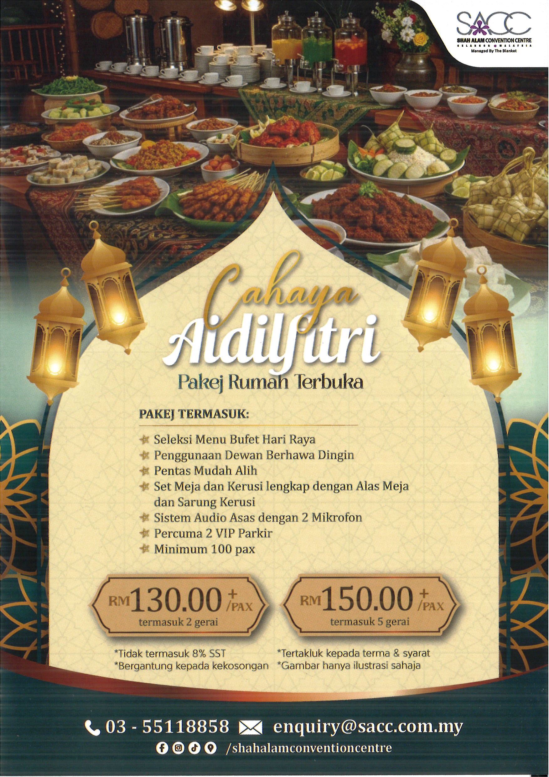 Tempahan awal amat digalakkan bagi memastikan pengalaman berbuka berjalan lancar bersama keluarga, rakan dan warga kerja. Untuk pertanyaan lanjut, pengunjung boleh menghubungi 03-5511 8858 atau melayari platform media sosial rasmi @shahalamconventioncentre.