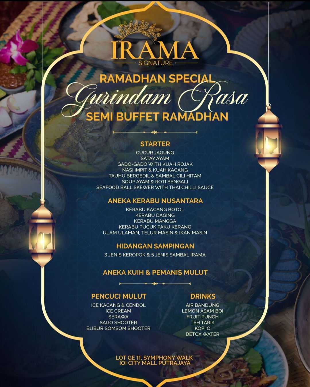 Senja Putrajaya pada jumaat 13 Februari 2026 terasa berbeza dari biasa. Langit yang perlahan menggelap seakan memberi isyarat bahawa sebuah pengalaman kulinari sedang menanti. Langkah saya terhenti di hadapan IRAMA Signature, ruangan yang berdiri anggun di Lot GE-11, Symphony Walk, Tingkat Bawah, IOI City Mall. Jam menunjukkan 7 malam, waktu Pratonton Ramadan pun bermula.