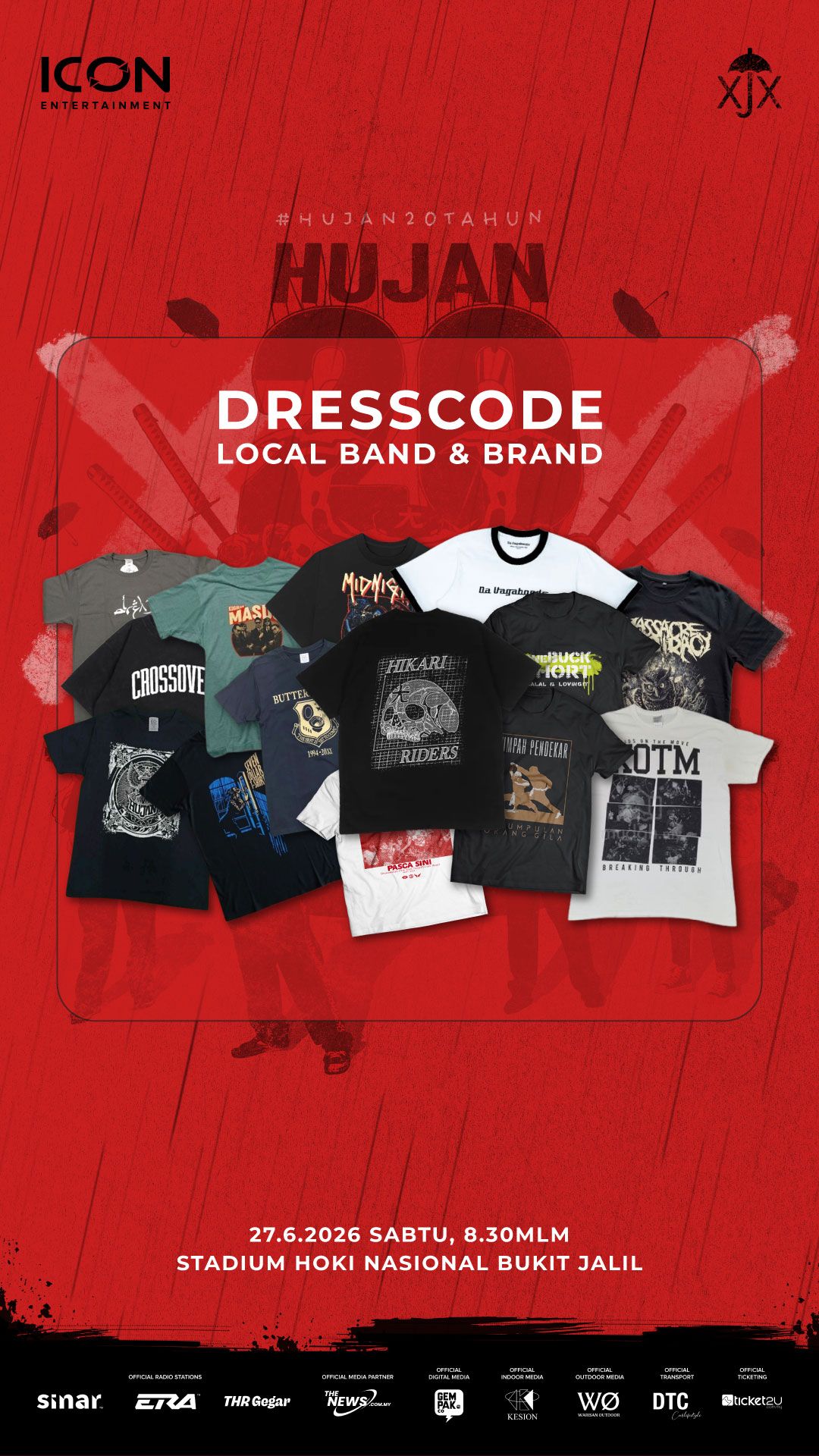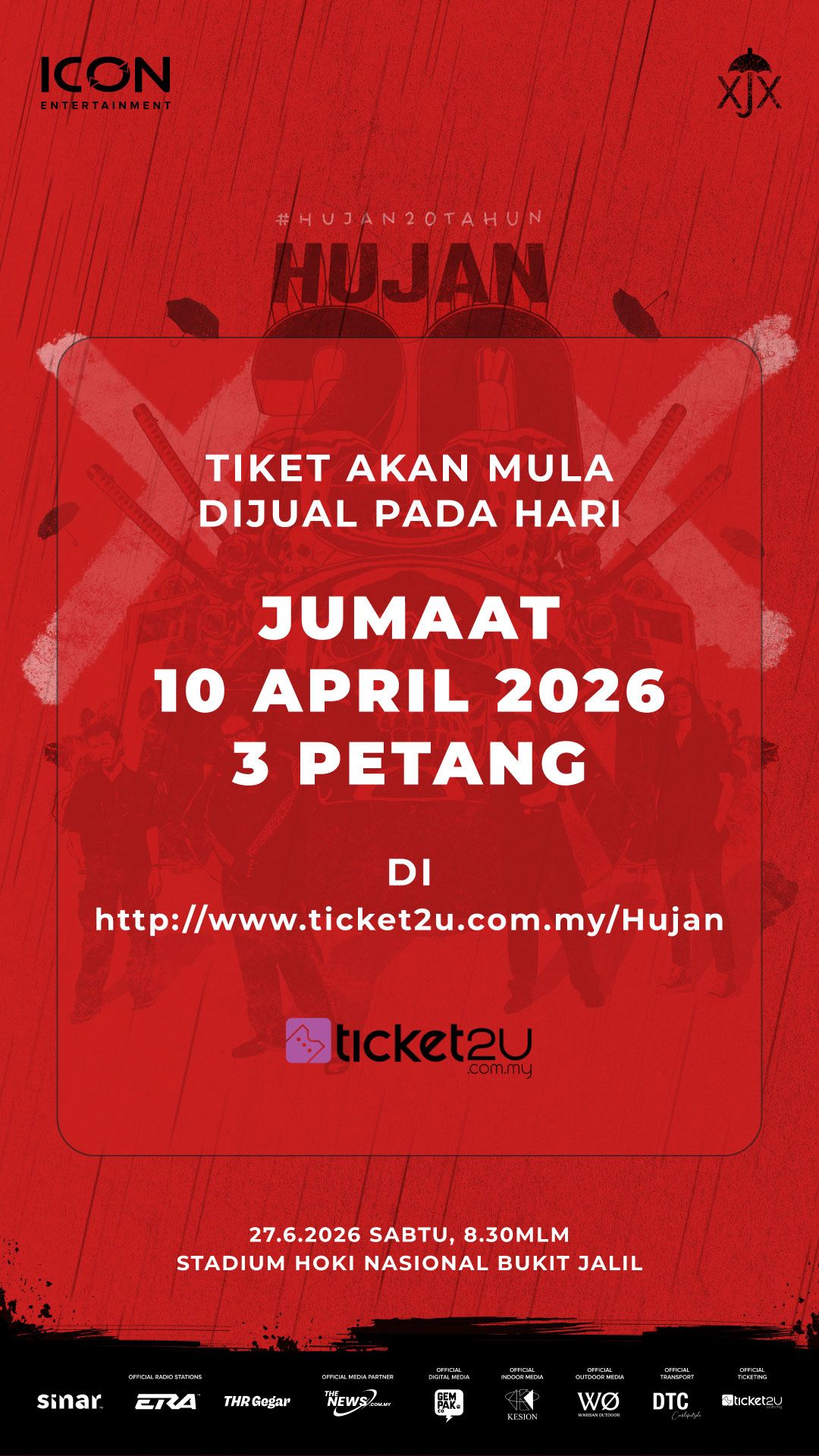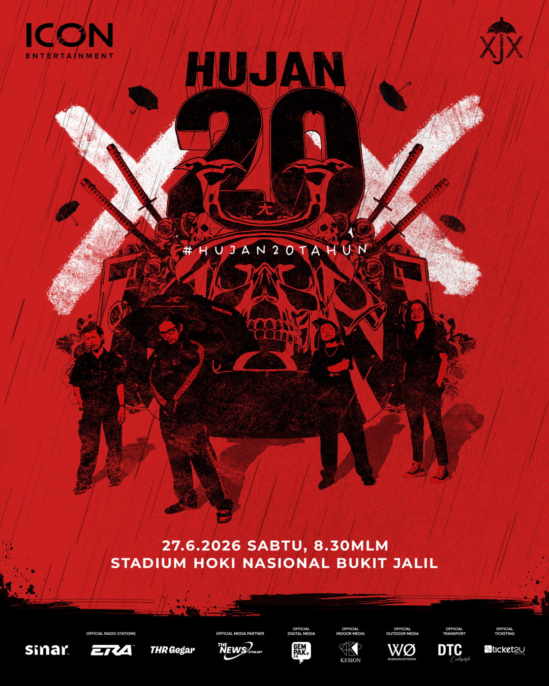 Maka lahirlah HUJAN XX : #HUJAN20TAHUN, sebuah perayaan yang bukan sekadar konsert, tetapi sebuah penghormatan kepada perjalanan panjang yang telah ditempuhi. Dianjurkan oleh ICON Entertainment, acara berskala besar ini bakal berlangsung di Stadium Hoki Nasional Bukit Jalil pada 27 Jun 2026, menghimpunkan peminat dari seluruh Malaysia, Singapura, Brunei dan Indonesia.