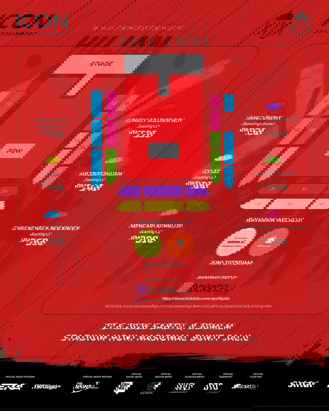 Menariknya, konsep perayaan ini turut mengajak penonton meraikan identiti tempatan dengan tema busana yang ringkas tetapi penuh makna iaitu dengan memakai baju band atau jenama tempatan sebagai simbol sokongan terhadap karya sendiri. Tiket pula ditawarkan dalam pelbagai kategori bermula RM158 hingga RM268 dengan nama-nama unik yang diinspirasikan daripada karya mereka seperti SANG ENEMY, 123 GO, MENCARI KONKLUSI, LONELY SOLDIER BOY, ABCDEFGHUJAN dan CHECKCHECK ROCKROCK. Jualan akan bermula pada 10 April 2026 jam 3 petang menerusi platform Ticket2U.