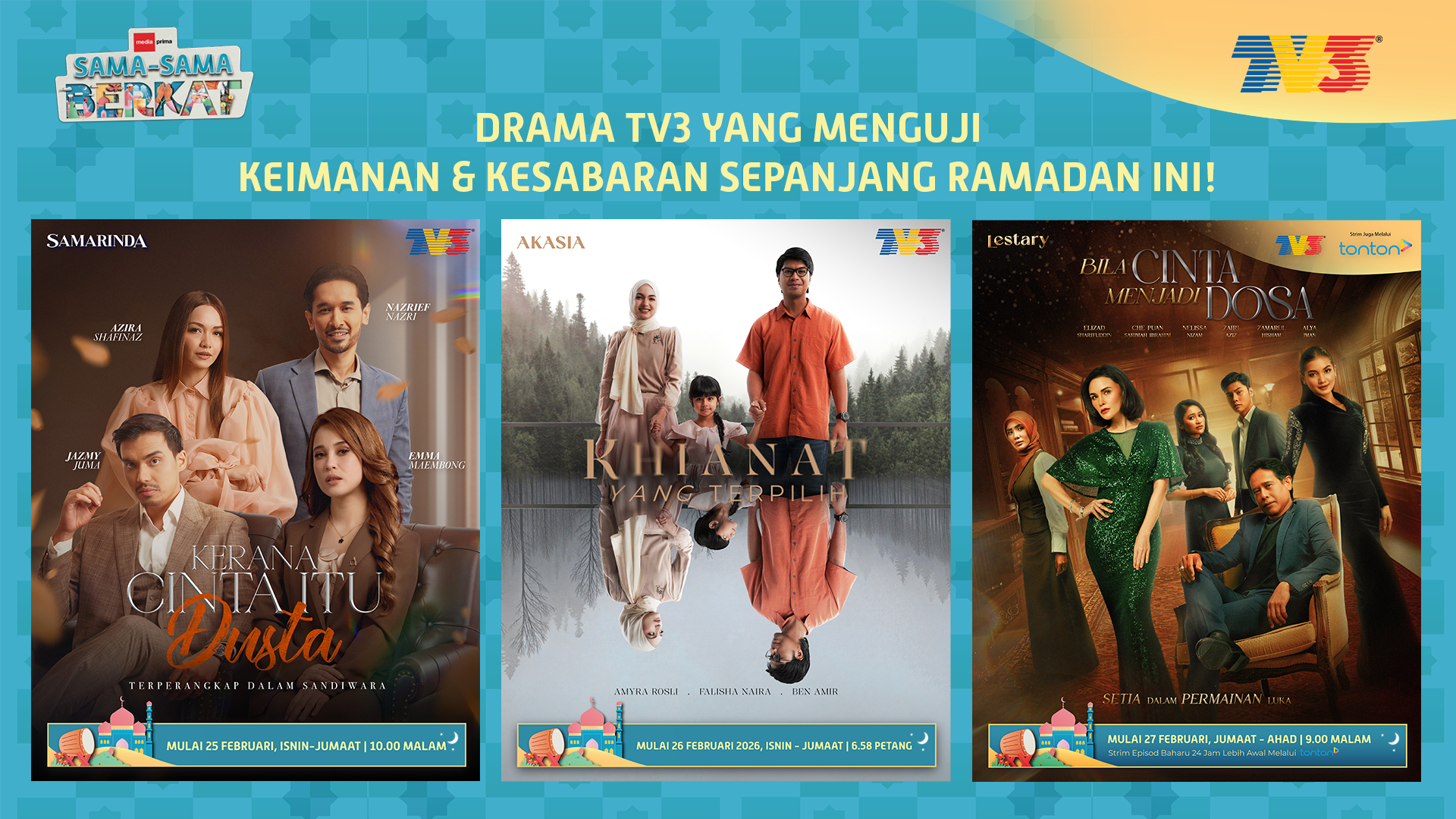 Langit Ramadan selalunya mengundang hening dan refleksi, namun tahun ini TV3 memilih untuk menggoncang rasa dengan tiga naskhah berturut-turut yang mula bersiaran bermula 25 Februari. Setiap drama hadir sebagai ujian hati, mengheret penonton menyusuri sisi rapuh manusia saat cinta, kepercayaan dan tanggungjawab bertembung tanpa amaran.