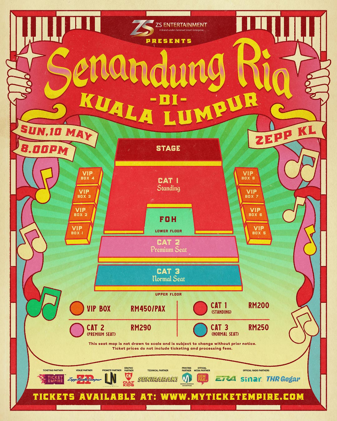 Konsert “Senandung Ria Di Kuala Lumpur” menawarkan beberapa kategori tiket iaitu Standing (RM200), Category 2 (RM290), Category 3 (RM290) dan VIP Box (1 Pax) berharga RM450. Maklumat lanjut mengenai saluran penjualan tiket akan diumumkan dalam masa terdekat. Mei ini, ibu kota bakal dihiasi cahaya retro, alunan jazz-pop dan romantika bandar yang mengalir lembut. Sebuah malam yang berpotensi menjadi memori panjang buat pencinta muzik yang menghargai estetika klasik dalam nuansa moden.