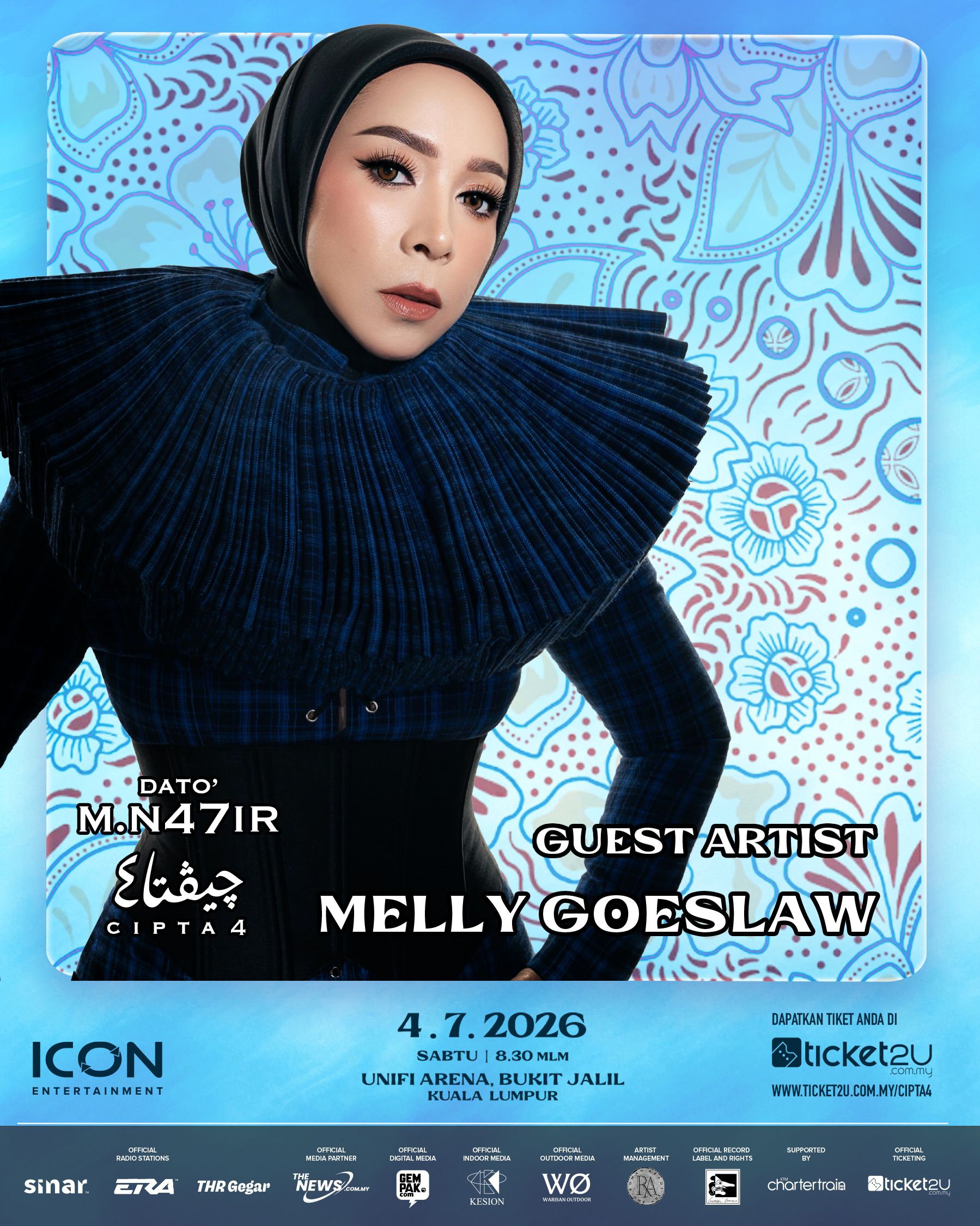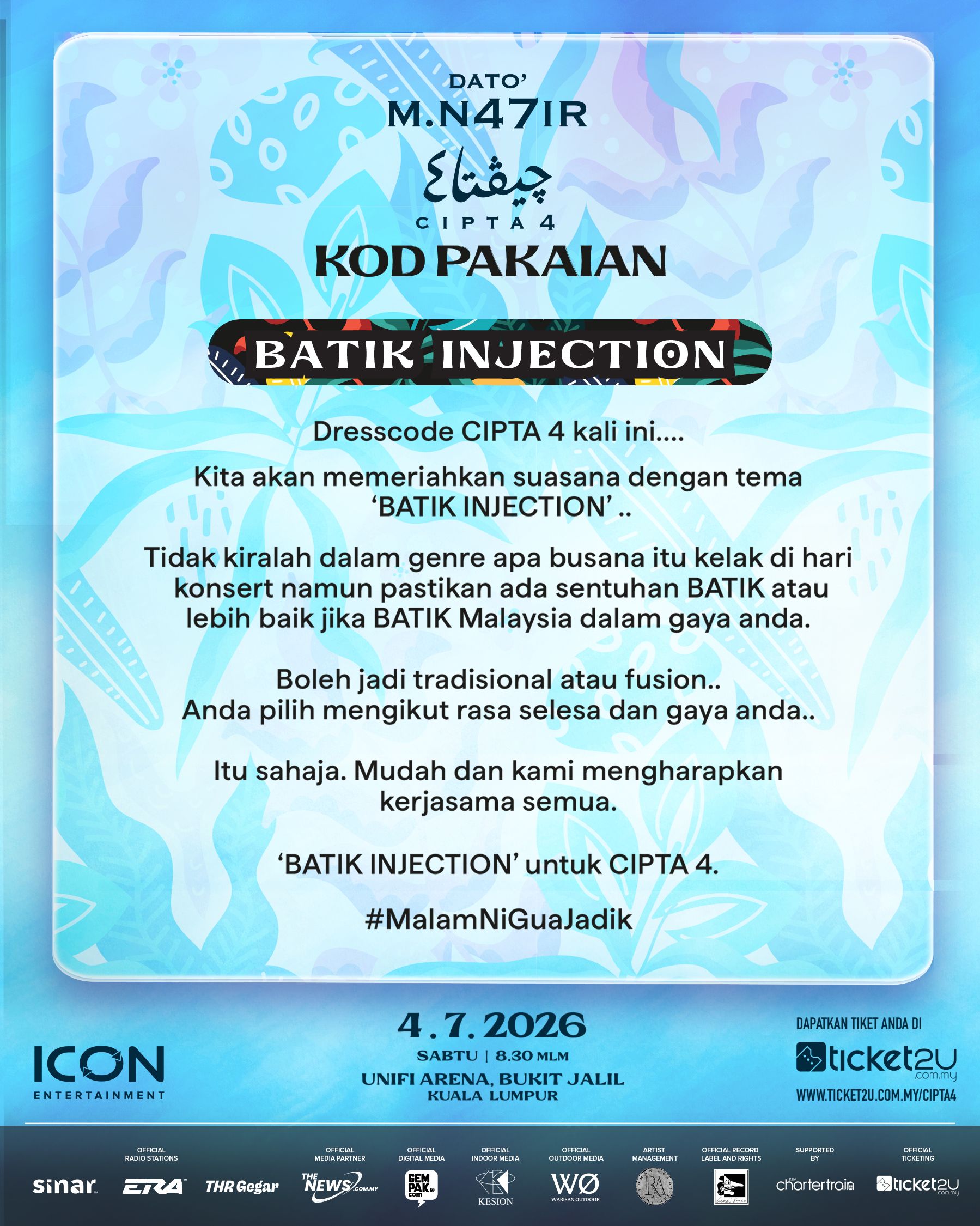 Kini, CIPTA 4 hadir sebagai pelengkap. Satu noktah yang membawa makna, tetapi dalam masa yang sama membuka ruang kepada kesinambungan yang lebih jauh. Bertempat di Unifi Arena Kuala Lumpur pada jam 8.30 malam, konsert ini bakal mempersembahkan karya-karya ikonik yang telah membentuk legasi M. Nasir: lagu-lagu yang bukan sekadar didengar, tetapi menjadi sebahagian daripada memori kolektif pendengar. Menurut Iman Tang, penganjuran CIPTA sejak awal memang dirancang sebagai sebuah perjalanan empat fasa. Setiap satunya membawa dimensi berbeza dalam meraikan karya seorang legenda.