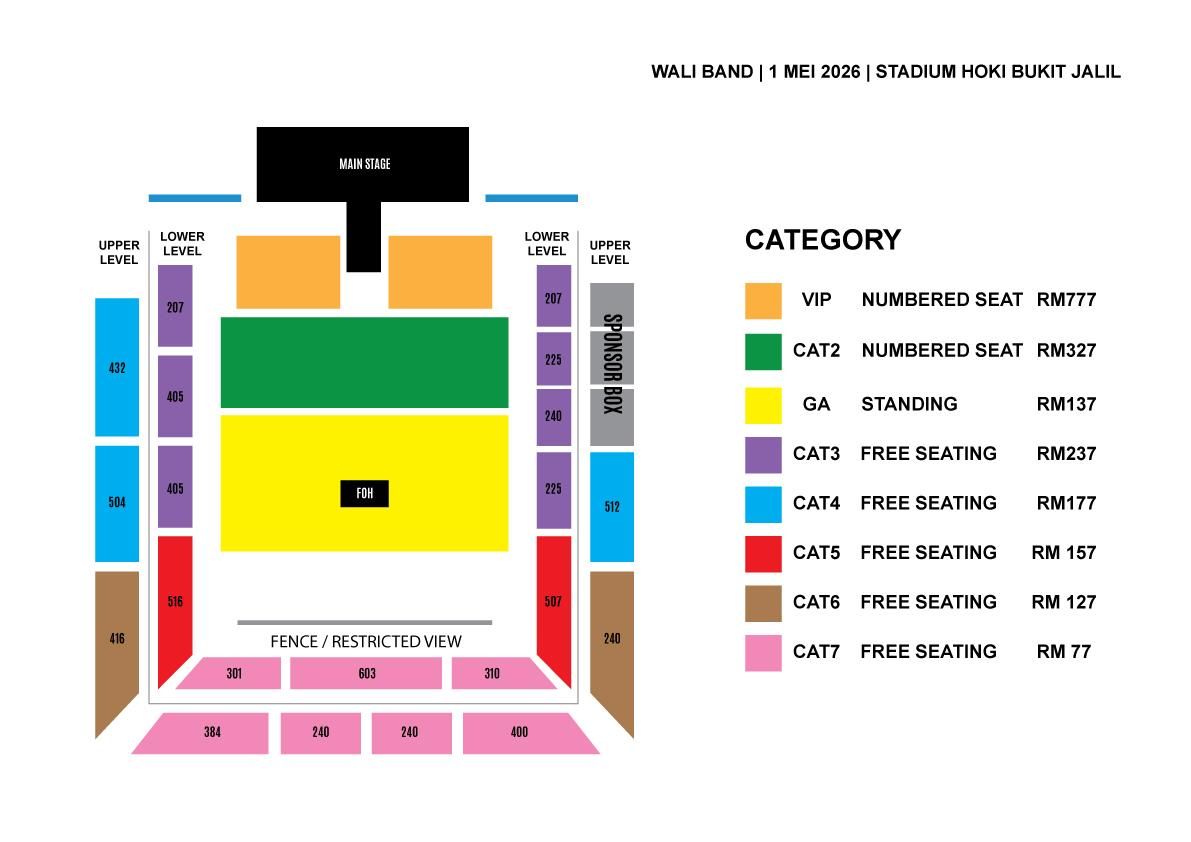 Jualan tiket akan bermula pada 16 Februari 2026 dengan harga RM777 (VIP), RM327 (CAT2), RM237 (CAT3), RM177 (CAT4), RM157 (CAT5), RM127 (CAT6), RM137 (GA) dan RM77 (CAT7). Penonton Konsert RadjaWali pula berpeluang menikmati diskaun 20 peratus menerusi kod promo tiket terdahulu yang boleh digunakan untuk pembelian dalam talian.